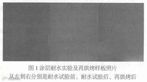 耐水试验后,涂层有一定的吸附水,这些吸附水在200℃×10min烘烤下是可脱离涂层从而基本恢复涂层原有外观和性能。