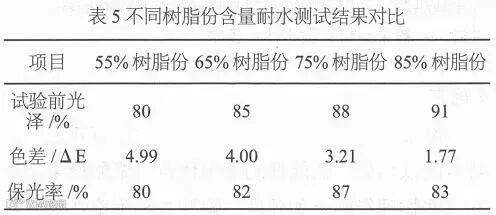 表5是NH8306和TGIC制备得到不同树脂份含量(聚酯树脂加上TGIC占粉末涂料配方的质量百分比)涂层的耐水试验结果。