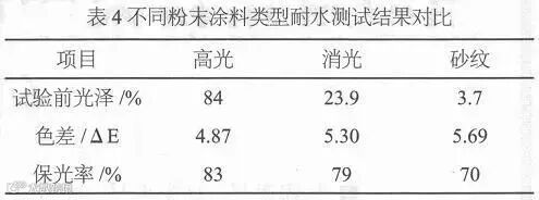 表4为NH8306采用TGIC制备的高光、消光和砂纹粉末涂料涂层的耐水试验结果。