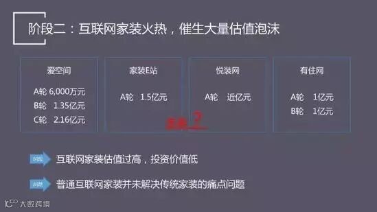 比如说爱空间、家装E站、悦装网、有住网都拿到了比较高的融资,哪怕公司再好,但估是好的投资,或者让我们难以下定决心去做这笔投资。普通互联网家装企业估值要合理,如果估值太高,可能是一家好公司,但不一定解决核心的家装痛点问题。
