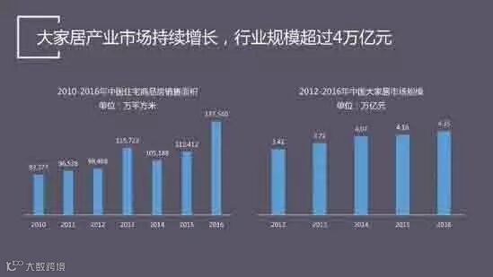 大家居产业是规模巨大的产业,到2016年行业总产值已突破4万亿,行业处于稳健的增长阶段。