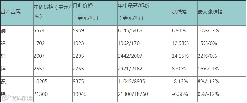 基本有色金属经过2016年的触底反弹后,今年上半年,铜、铅、锌、镍都呈现先涨后跌,而后在6月14日美联储宣布本年度第二次加息后,又出现一波快速反弹上涨;铝价震荡上涨,锡价高位震荡。
