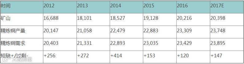 根据国际铜业研究小组(ICSG)4月发布的最新预测,2017年全球精炼铜供给量为2374.8万吨,精炼铜需求量为2389.5万吨,全球市场短缺14.7万吨。而ICSG在2016年10月发布的报告中认为:2017年全球精炼铜供给量2379万吨、全球精炼铜需求量2363万吨,全球市场供给过剩16.3万吨。对供给的预测降低(特别是2017年上半年,全球几大铜矿生产商陆续迎来罢工潮,对全球铜矿供给产生显著影响。2月初全球最大铜矿智利Escondida铜矿持续罢工了40余天,3月秘鲁第一大铜矿Cerro Verde铜矿罢工,全球第二大铜矿Grasberg铜矿先后遭遇印尼政府限制出口和工人罢工,以上事件致使2017年全球铜矿供给减少约30万吨)和对需求的预测提升,导致市场短缺扩大。