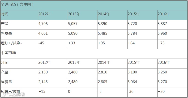 根据国际铝业协会(IAI)数据,2016年全球电解铝产量5887万吨、消费量5960万吨,短缺73万吨;中国电解铝产量3250万吨、消费量3270万吨,短缺20万吨。