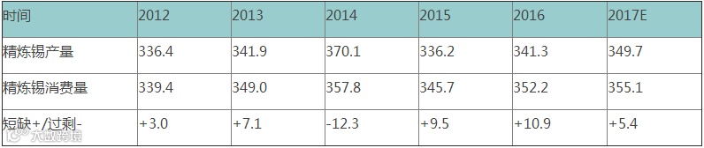 根据国际锡业协会(ITRI)的统计,2016年全球精炼锡产量为341.3万吨,消费量为352.2万吨。马来西亚冶炼公司(MSC)预计,2017年全球精炼锡产量为349.7万吨,消费量为355.1万吨,短缺约5000吨,相比2016年短缺程度减小。由于锡价目前处于高位,矿山盈利可观,因此矿山进一步减产的可能性小,且随着锡价的反弹,再生锡的供给量也将会增加,整体来看,2017年的锡供应量多于2016年。