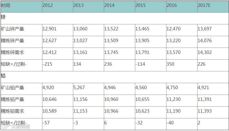 国际铅锌研究小组(ILZSG)在2017年4月发布的最新数据预测,2017年全球矿产锌产量约为1370万吨,比上年增加9.8%;精炼锌产量约为1408万吨,比上年增加6.5%,精炼锌产量增幅低于矿产锌3个百分点。ILZSG预计2017年全球精炼锌需求量为1430万吨,短缺22.6万吨,连续两年维持短缺,但相比2016年短缺程度有所降低。