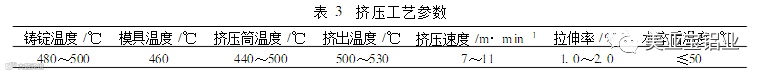 (6)6082铝合金型材拉伸矫直,应将拉伸率控制在1.0%-2.0%范围内。挤压工艺参数见表3。