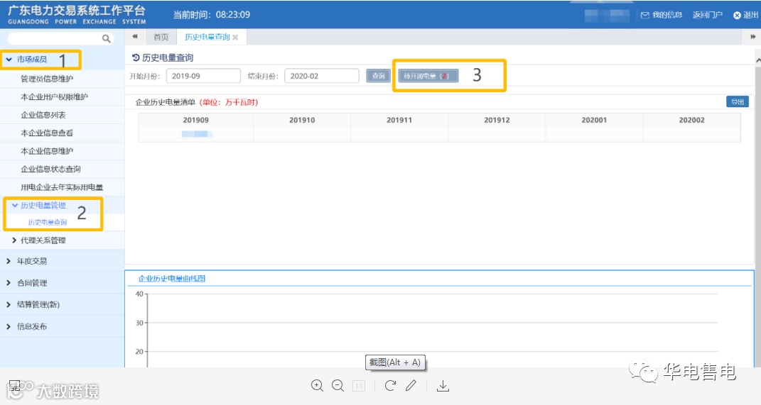 登录广东电力交易中心系统,点击“市场成员”选项,点击“历史电量管理”,点击“历史电量查询”,点击“待开通电量”,勾选华电广东能源销售有限公司 。