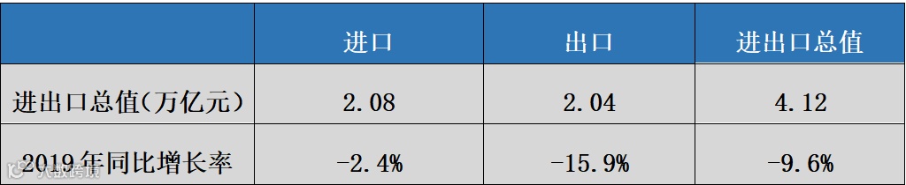 2020年1-2月,我国外贸进出口情况较2019年同期出现明显下降,外贸出口总值为4.12万亿元,较2019年同期下降9.6%,其中出口2.04万亿元,同比下降15.9%,进口2.08万亿元,同比下降2.4%。