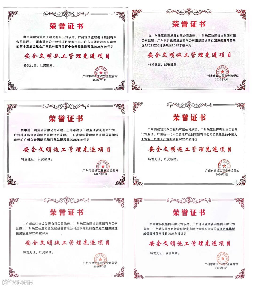 2026年1月13日,市住建局举办“2025年市管房屋建筑工程安全生产总结会议”,会上通报表彰2025年度“安全文明施工管理先进项目”。本次表彰共设10个名额,珠江监理参建的6个项目成功入选,具体包括:第十五届全运会广东奥林匹克体育中心升级改造项目、白鹅潭聚龙湾启动区AF0212062地块项目(聚龙湾9#地块)、广州白云国际机场T3航站楼项目、中国人工智能(广州)产业园项目、石丰路二期保障性住房项目、天河区奥体新城保障性住房项目。