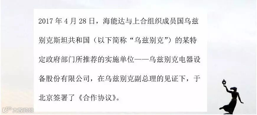 自国家实施一带一路战略以来,海能达紧跟国家的走出去步伐,为了维护和保障地区的安全与稳定,提升当地的专网通信水平,乌兹别克引进全球领先的专网通信高科技技术,与海能达在乌兹别克境内开展深度合作。根据《合作协议》,海能达终端设备的装配量将不少20,000台,并负责对乌兹别克电器设备股份有限公司输出约定生产/装配文档及有关技术信息,确保组装生产的完成;同时负责协助合作方建立培训中心、提供临时性用途的展示、宣传用途的产品和模具等,并派遣技术人员对合作方提供必要的培训。该项目的成功实施能够为乌兹别克引进先进技术,带动本地制造业的发展,提升相关产品的本地化比例,并增加本地人员就业,得到乌兹别克有关政府部门的大力支持。