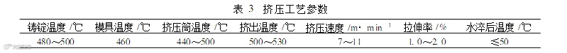 (6)、6082铝合金型材拉伸矫直,应将拉伸率控制在1.0% ~2.0%范围内。挤压工艺参数见表3。