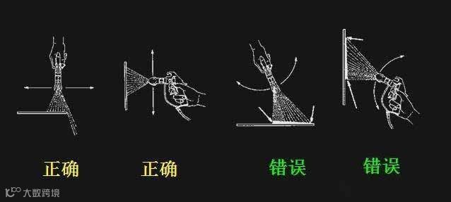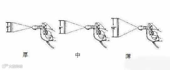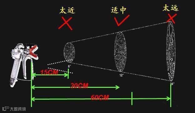 喷枪与需喷涂表面的距离要保持12英寸远(大约30厘米),水平和竖直方向都应对准需喷涂表面。选择较大喷嘴时,需要加大喷枪与需喷涂表面的距离。在喷涂过程中,要确保喷枪与需喷涂表面时刻保持水平,如果喷枪与需喷涂表面产生角度,喷涂效果将会产生明显不均衡的厚度。