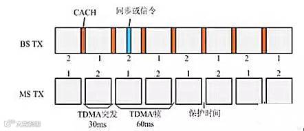 转发模式是指两个对讲机之间的通信必须经过基站的转发,DMR的基站可以采用同频转发,也可以采用异频转发。 带CACH的业务信道(下行信道) 带CACH的业务信道适用于双频BS到MS的下行传输,见图1的上半部分。信道包括两个TDMA业务信道(ch1和ch2)以及一个用于传输信道号、信道接入指示和低速数据的公共通知信道。一旦BS被激活,带CACH的业务信道便连续发送,如果没有业务信息要发送,BS将使用空闲信息填充后发送。 带保护时间的业务信道(上行信道) 带保护时间的业务信道适用于从MS到双频BS的上行传输,包括两个TDMA业务信道(ch1和ch2),两个业务信道中间为一段保护时间,用于功率放大器的上升及传播时延。这种信道类型也有三种通信方式: 方式1:两个信道分别传输一路业务; 方式2:单个信道(ch1)用于传输业务; 方式3:一个信道用于传输业务(ch1),另一个用于传输反向信道突发(ch2)。 方式1也可用于单频BS,此时可支持一路同频转发。