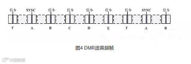 DMR语音采用超帧结构进行传输,每个超帧中包括6个突发,时长360ms,见图4,超帧中的突发用字母A~F标识。突发A表示超帧的开始,A的中间部分传送同步字SYNC,突发B到F的中间传送嵌入信令。数据/控制突发没有超帧结构。