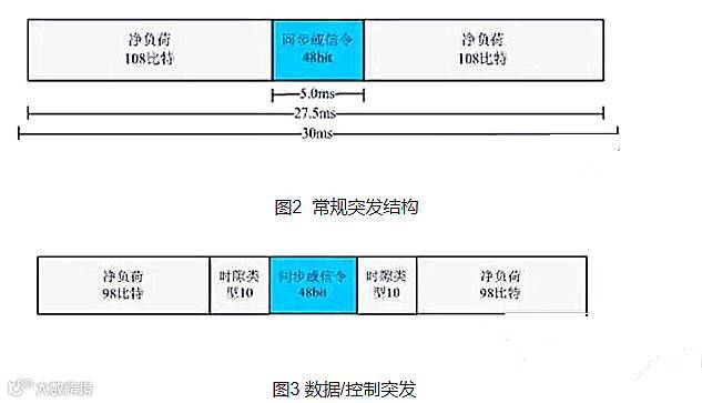 DMR的突发分为业务突发、公共通知信道(CACH)突发和反向信道(RC)突发三种,分别包括264比特、24比特和96比特数据。业务突发又分为常规突发和数据/控制突发两种,见图2和图3。常规突发用于传输用户语音,每个突发包括两个108比特的负载域和一个48比特的同步或信令域。负载域可以传输216比特的压缩语音,同步或嵌入信令域用于传输同步字或RC信令。每个突发的时长为30ms,其中27.5ms用于传输264比特的数据;上行帧中剩余的2.5ms作为保护时间;下行帧中剩余的2.5ms用作CACH,传送TDMA帧号、信道接入指示以及低速信令等信息。 数据/控制突发结构与常规突发类似,只是把常规突发两个净负荷域各拿出10个比特作为时隙类型域,用于指示负载域信息的含义。