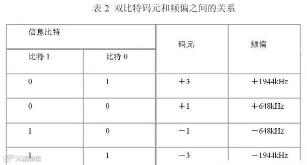 DMR采用4FSK调制,每个双比特码元对应一个载波频偏,两者之间的关系见表2,4FSK调制技术对发射机频率稳定度的要求比较严格,指标分别见表3和表4。