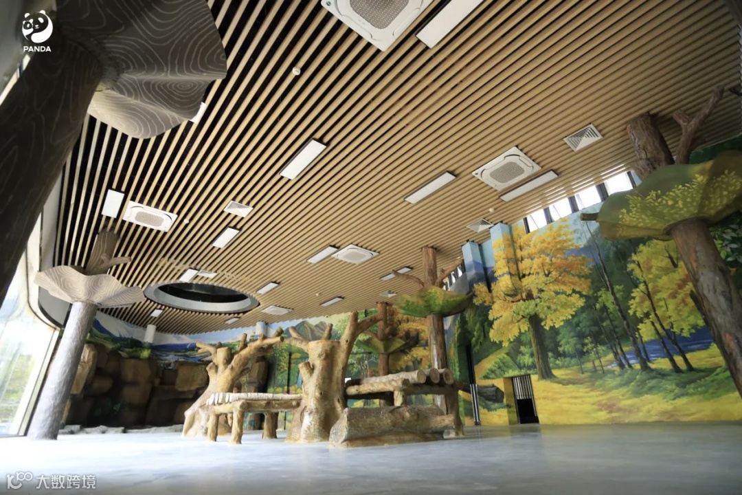 值得注意的是,此次室内兽舍及展厅配备了先进的空调及新风系统,可实现全年精准的温度控制,有效保障大熊猫防暑降温,目前设备运行稳定良好。室外活动场地形高低起伏,种植了乔木、灌木和草坪,营造出自然生态的环境,还精心设置了栖架、滑梯、倒伏树木、饮水池、戏水池等丰容物,墙面绘有与实景融合的彩画,为大熊猫打造了最为适宜的生活空间。