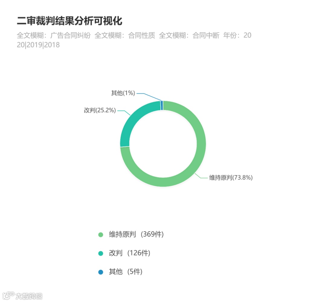 通过对二审裁判结果的可视化分析可以看到,维持原判的有369件,占比为73.8%;改判的有126件,占比为25.2%;其他的有5件,占比为1%。