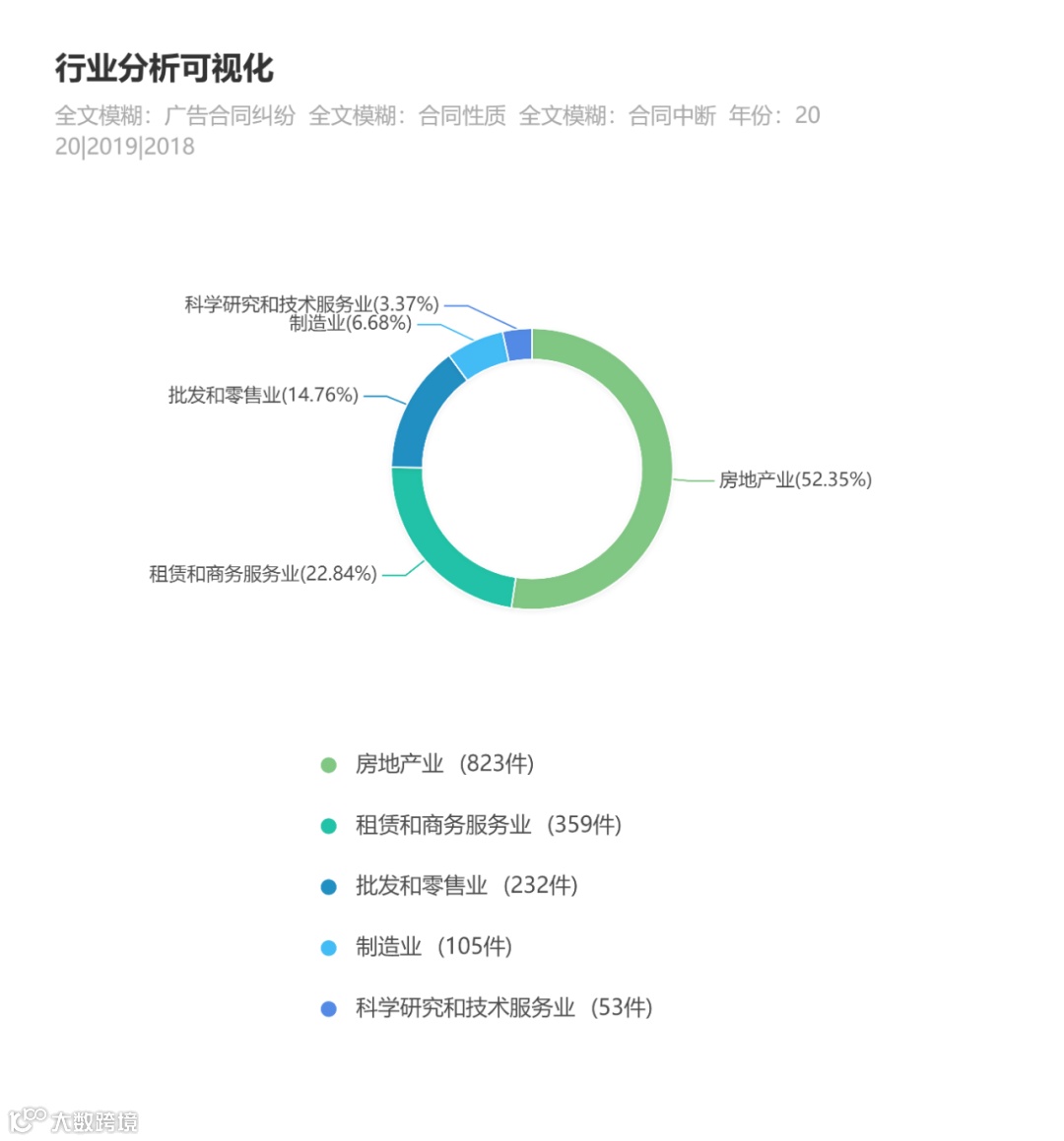 从行业分类图可以看到,近三年来,广告合同纠纷当前的行业分布主要集中在房地产业,租赁和商务服务业,批发和零售业,制造业,科学研究和技术服务业。