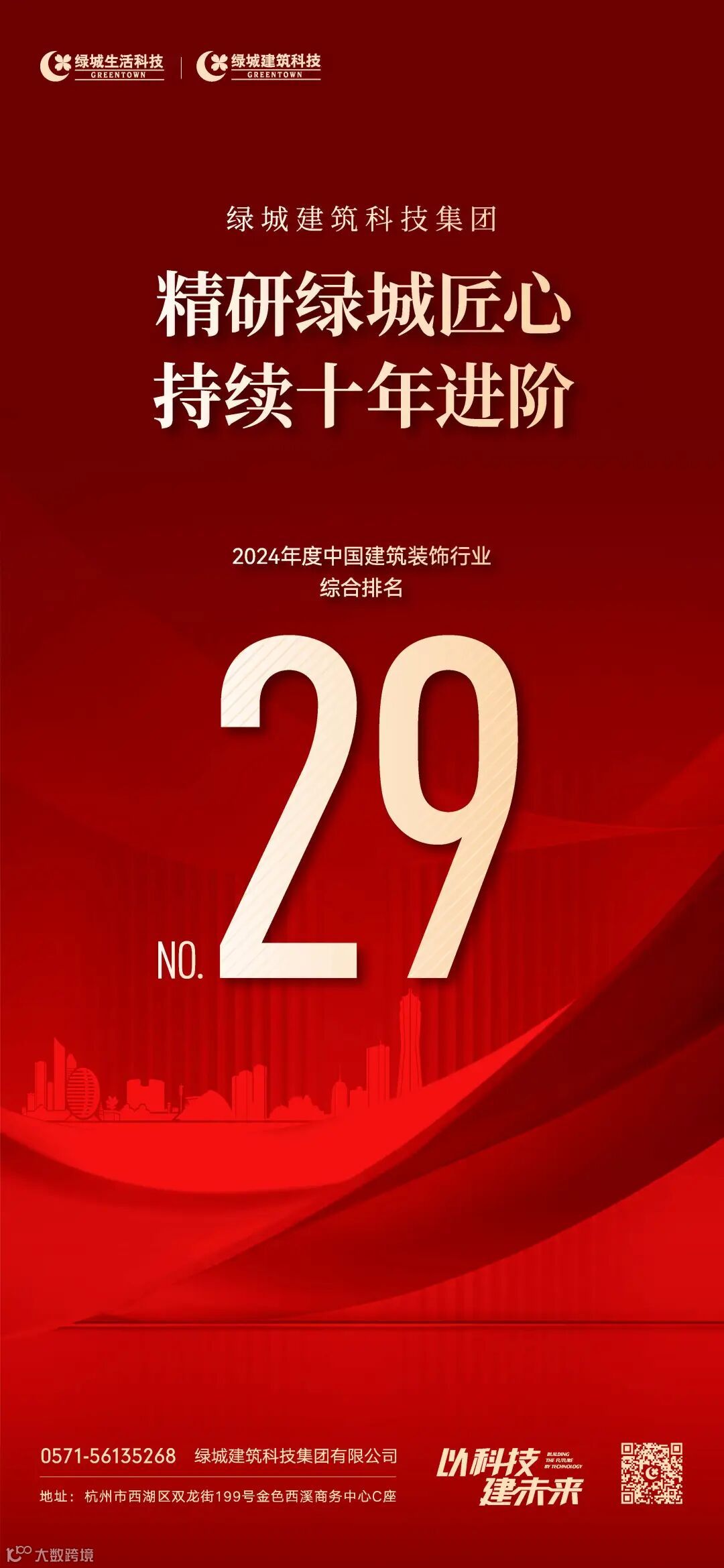 会上,2024年度中国建筑装饰行业综合数据统计报告正式发布。绿城建筑科技集团凭借持续创新和稳健经营,连续10年上榜,排名不断提升。2024年度位列行业第29位,实现新突破!