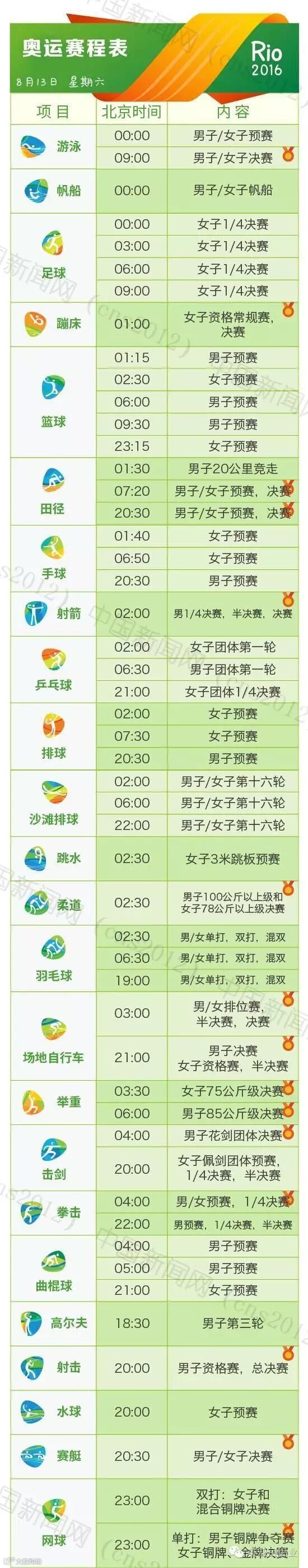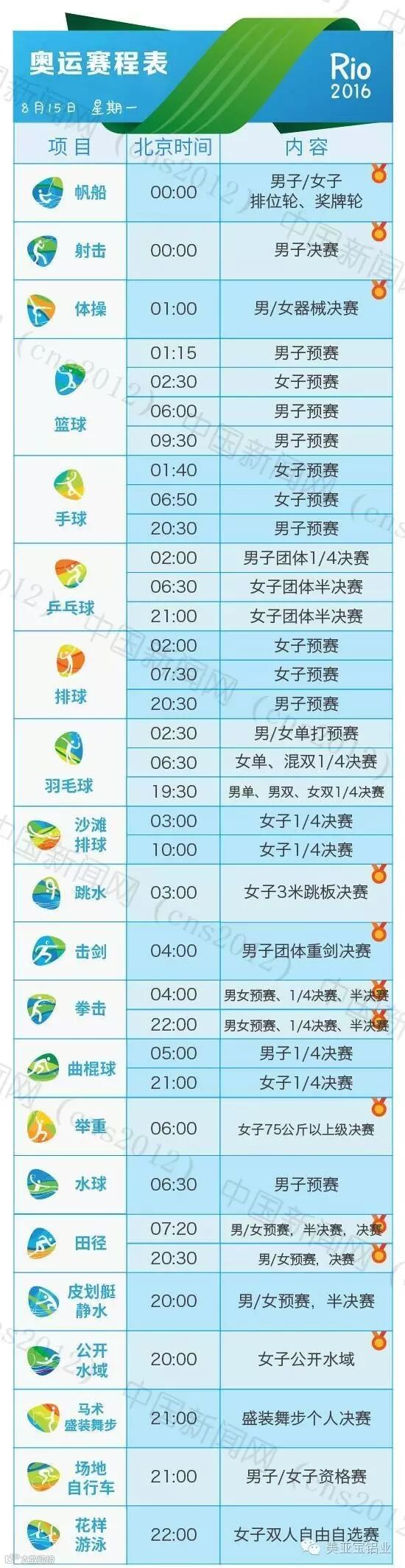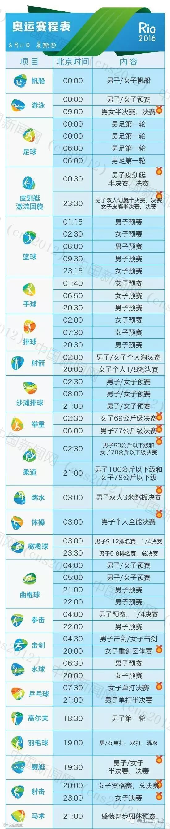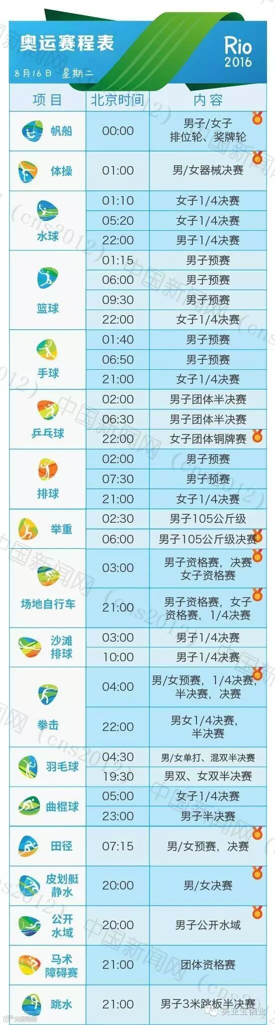 里约热内卢和北京有11个小时的时差,所以许多精彩的比赛可能会在夜间或者凌晨。我们贴心地为您准备了用北京时间标示的详细赛程表,全部项目都在上面了。要看比赛,就可以对照这个详尽的单子上闹铃啦~
