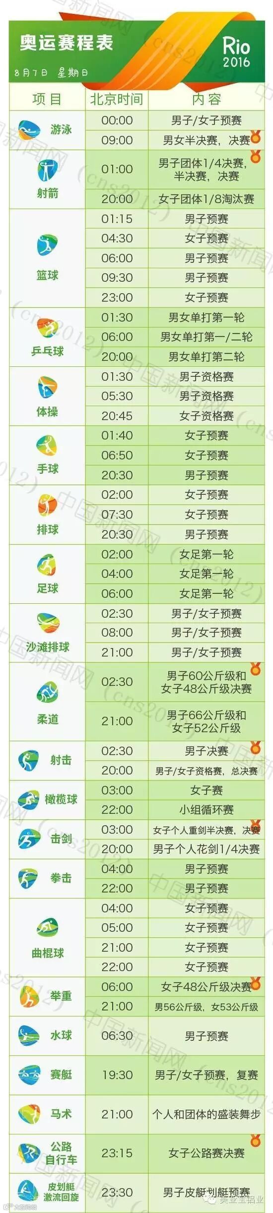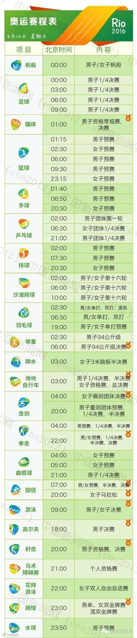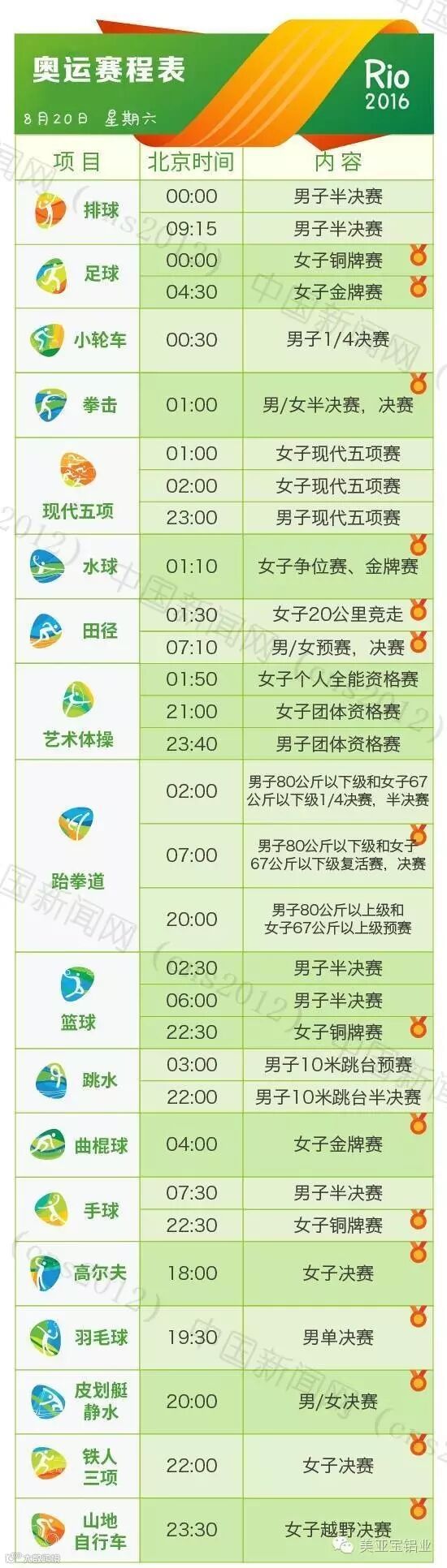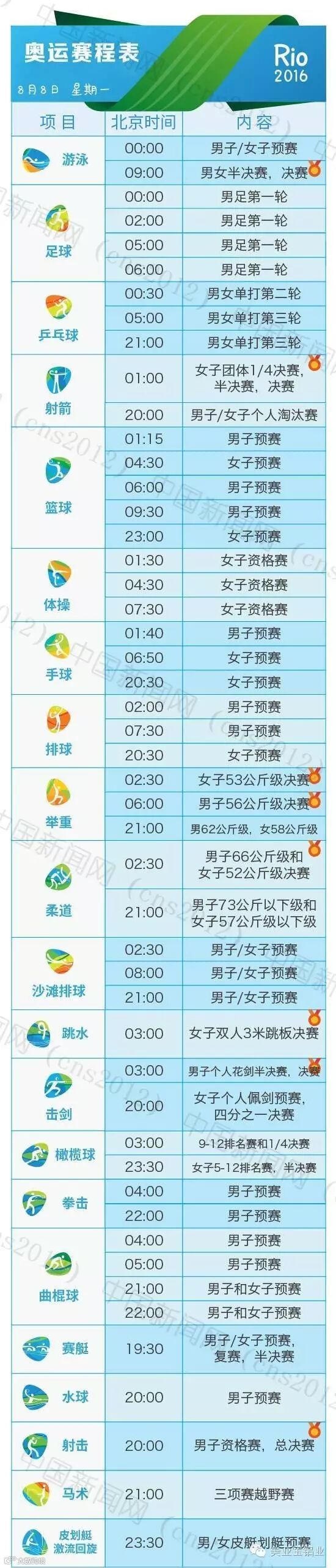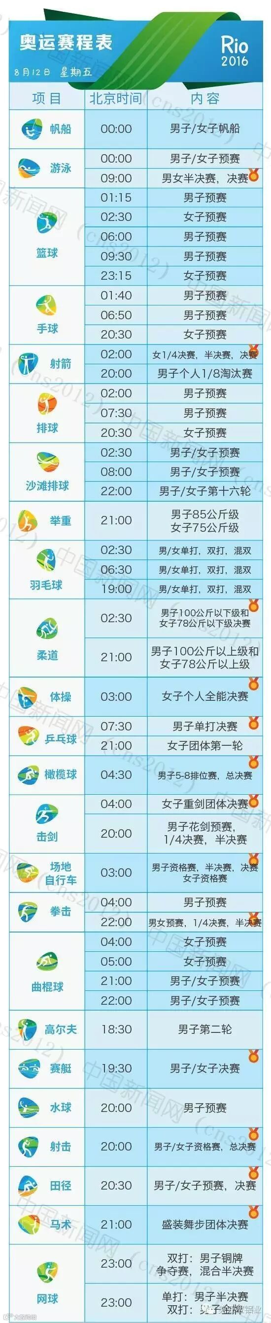 里约热内卢和北京有11个小时的时差,所以许多精彩的比赛可能会在夜间或者凌晨。我们贴心地为您准备了用北京时间标示的详细赛程表,全部项目都在上面了。要看比赛,就可以对照这个详尽的单子上闹铃啦~
