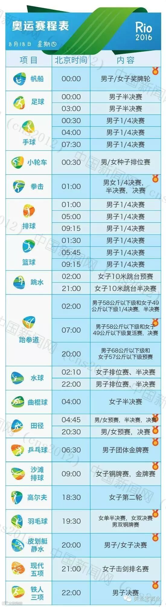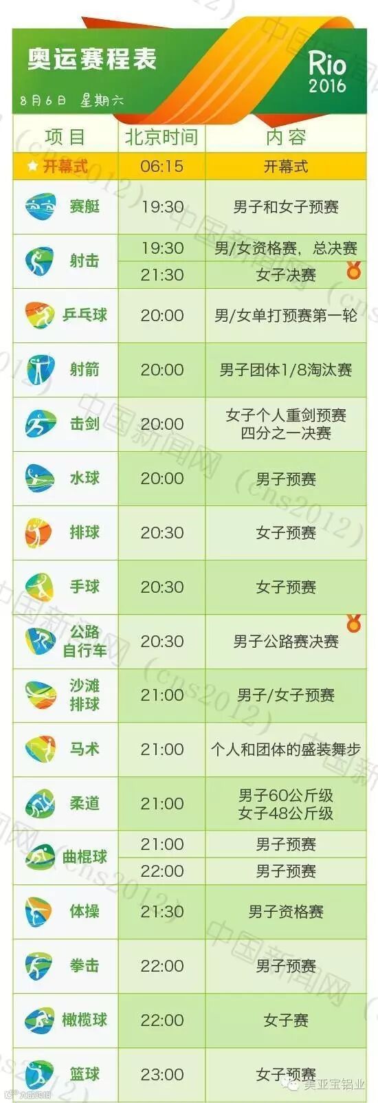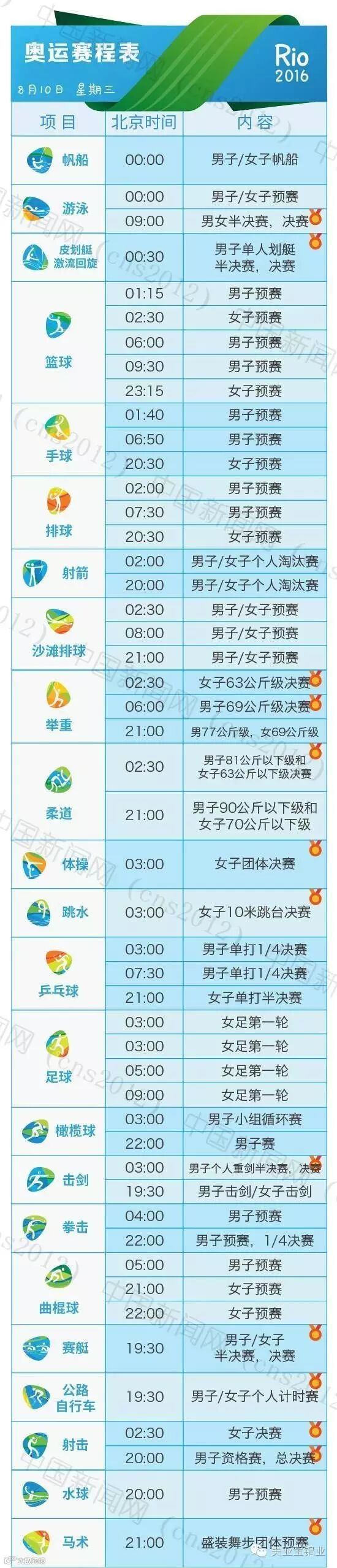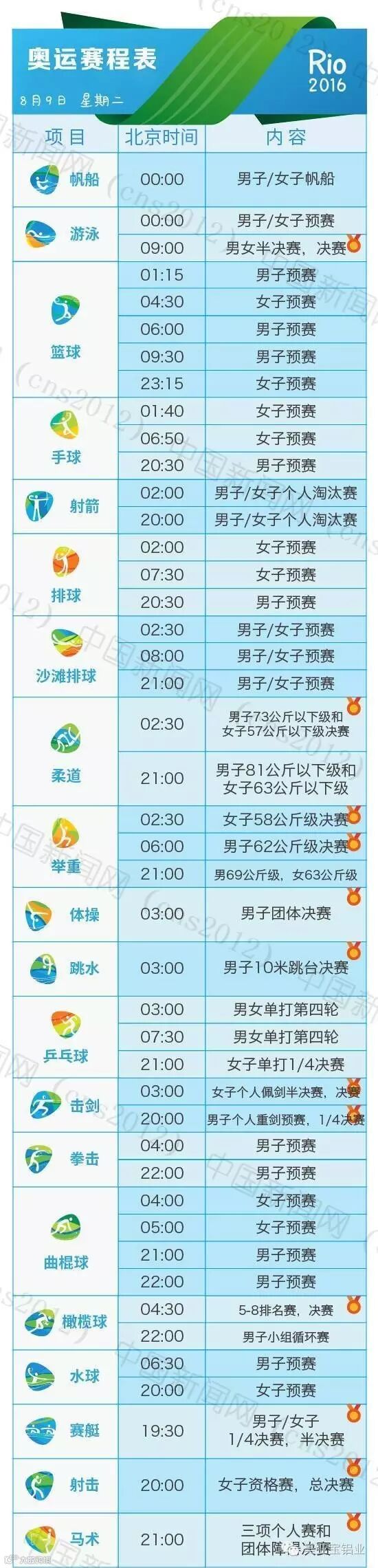 里约热内卢和北京有11个小时的时差,所以许多精彩的比赛可能会在夜间或者凌晨。我们贴心地为您准备了用北京时间标示的详细赛程表,全部项目都在上面了。要看比赛,就可以对照这个详尽的单子上闹铃啦~