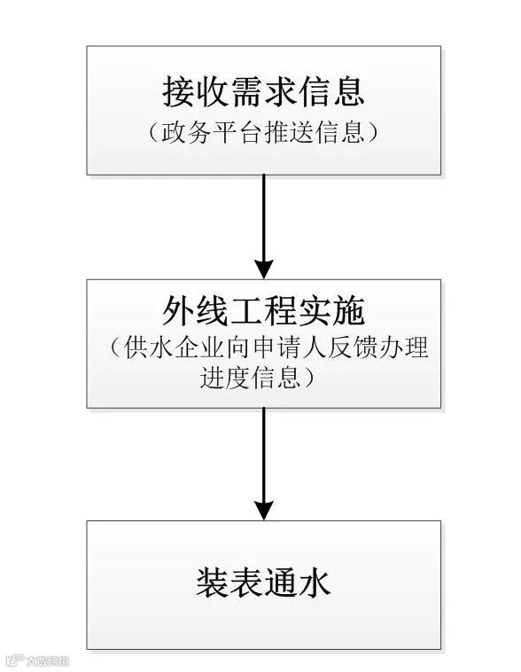 与建设工程规划和施工许可联办,政务平台自动推送信息至供水企业。供水企业接收信息后在承诺时间内自行完成现场踏勘、方案设计、管道施工、装表等环节,并向建设单位发送阶段信息。 |