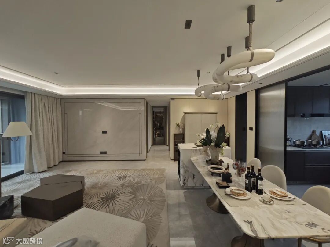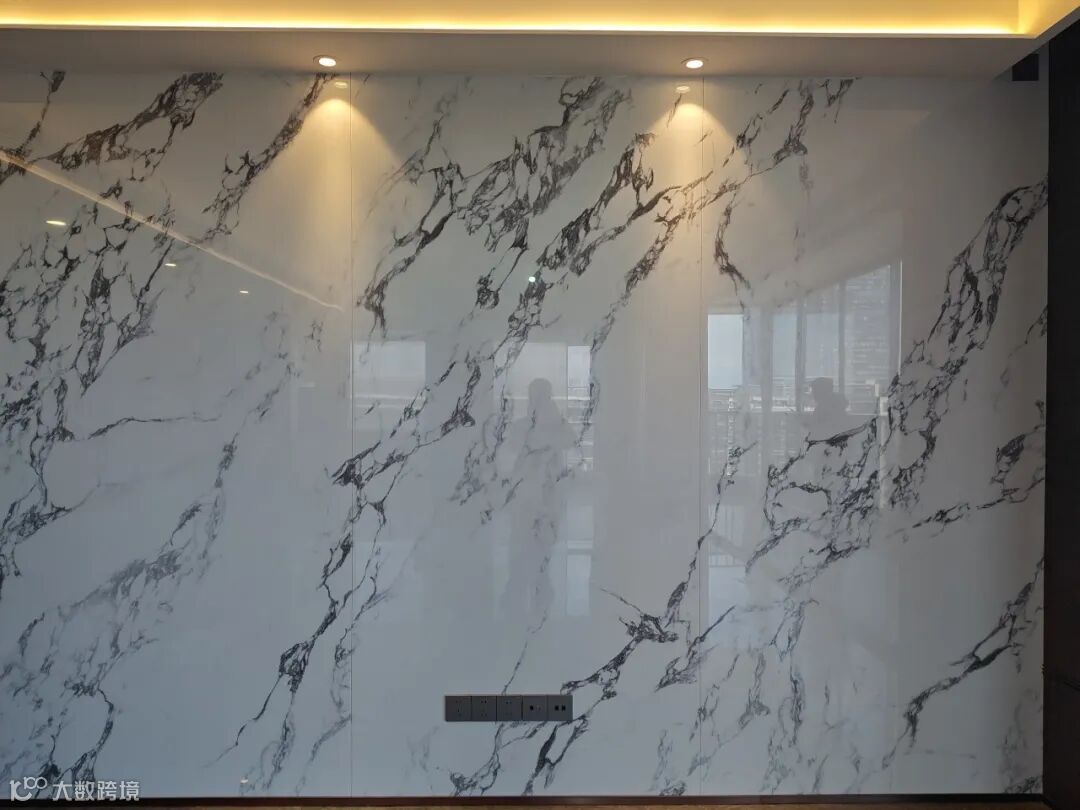 在户内背景墙施工中,项目团队精细选材,既保留了天然石材的高级质感,又与浅木色墙板形成冷暖对比,兼具奢华与松弛的居住氛围。大理石天然纹理如流云舒展,浅米色岩板与暗藏灯带,彰显豪华质感。