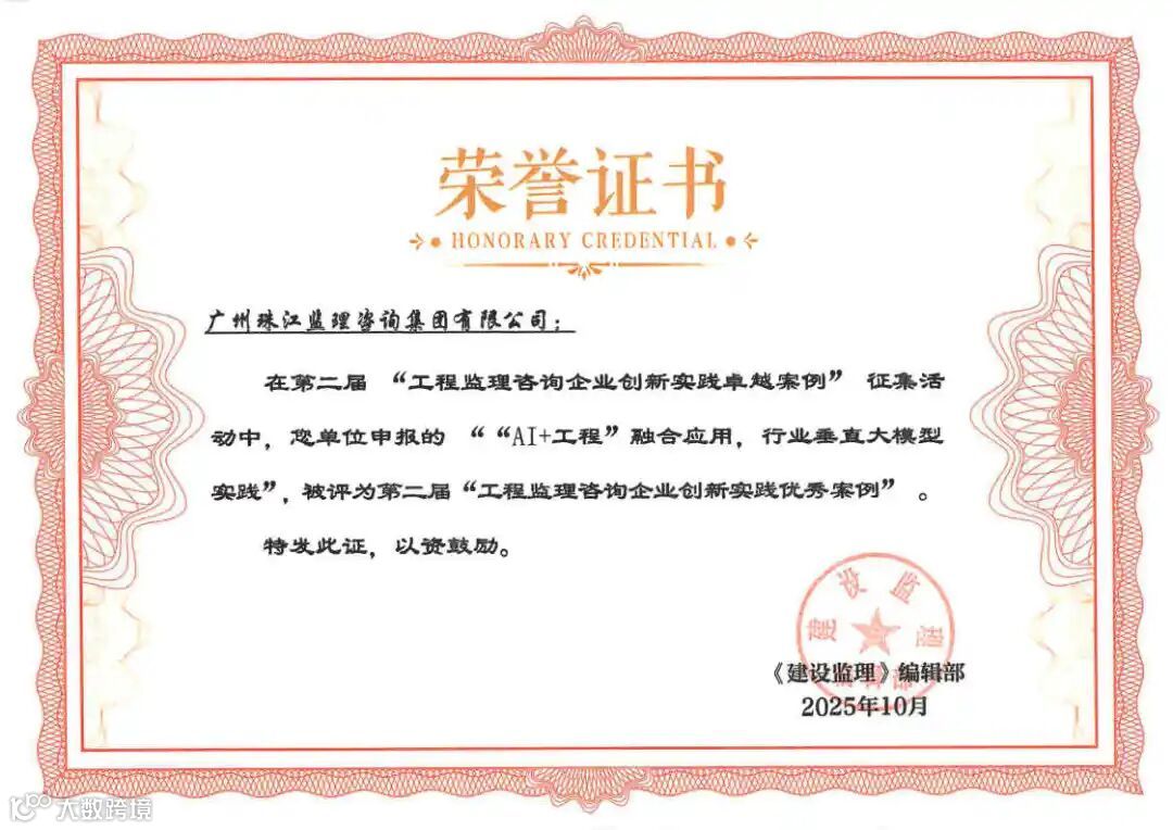会上,珠江监理报送的“AI+工程融合应用行业垂直大模型实践”获得2025年“工程监理咨询企业创新实践优秀案例”。“AI+工程咨询”已成为监理行业未来发展的重要方向,珠江监理以自身深厚的行业技术底蕴提前布局,不但提升了自身的行业影响力,更是进一步推动了监理行业数智转型升级。