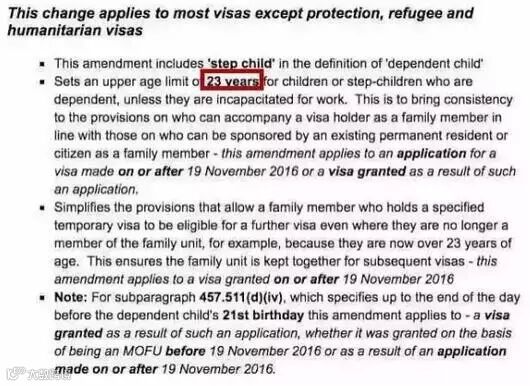 近日,澳大利亚移民局官网公布最新消息,从2016年11月19日起,将澳大利亚移民申请人随行子女的年龄要求调整为18周岁以下未婚子女或者18至22周岁(含22周岁)、就读于全日制课程并且经济上依附于主申请人的未婚子女。