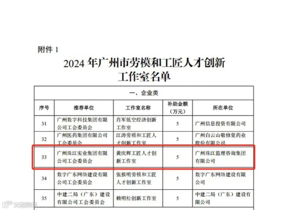 近日,广州市总工会公布2024年广州市劳模和工匠人才创新工作室名单,广州珠江监理咨询集团有限公司“黄庆辉工匠人才创新工作室”入选。