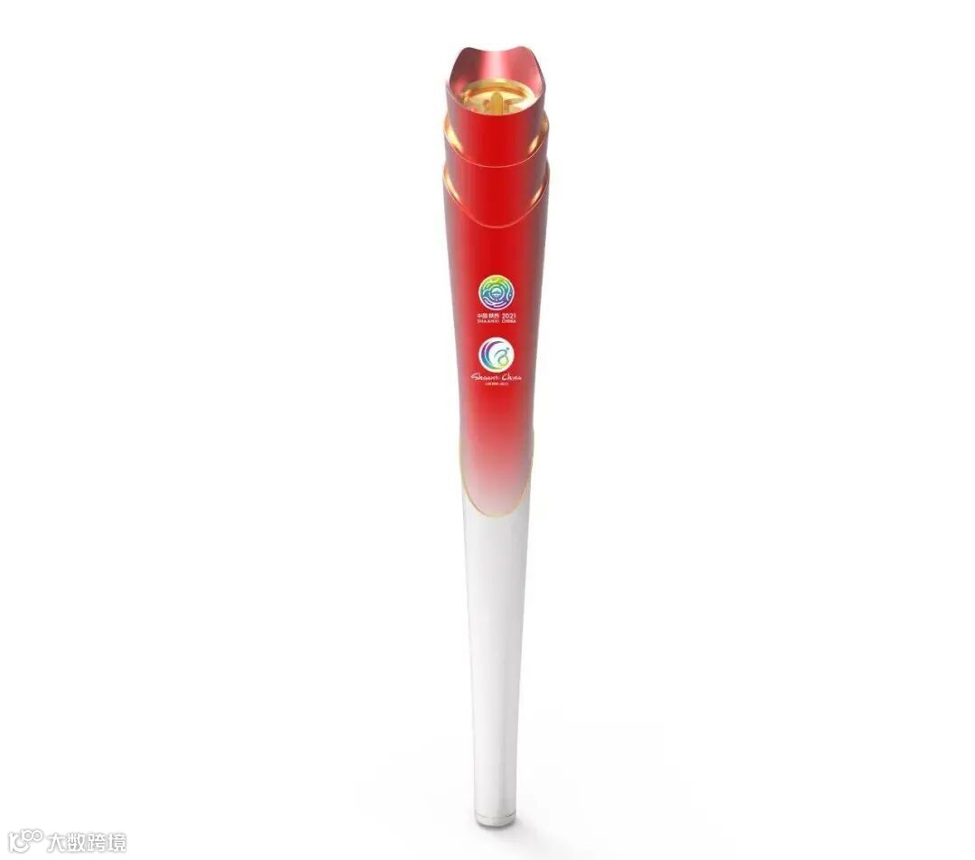 火炬上部分设计层次丰富、具有张力、动感十足,分层采用金色包边。出火口设计灵感源于山丹丹花,具有浓郁的陕西地域文化特点。正面同时出现两个会徽,意为“两个全运 同样精彩”。手柄部分采用白色,对比强烈,非常醒目,手柄部背面有火炬传递标识--圣火飞扬。