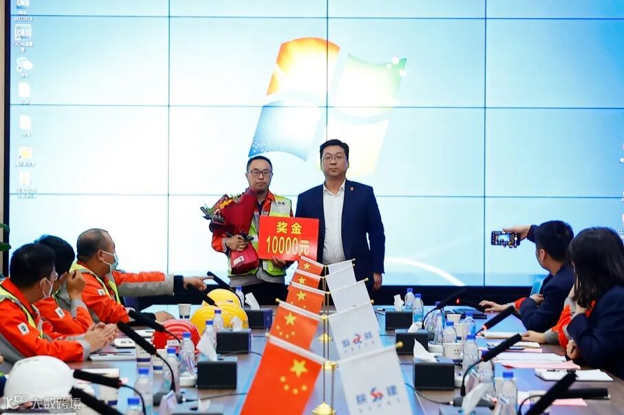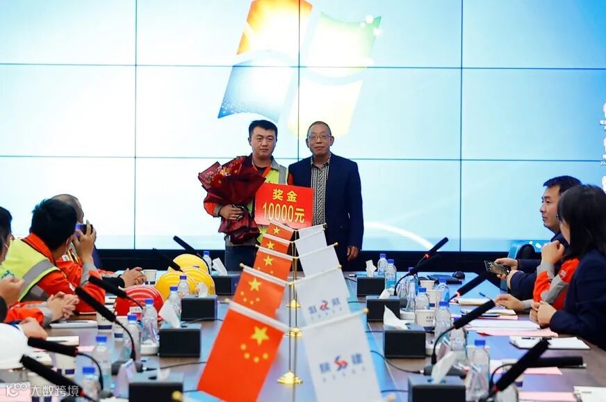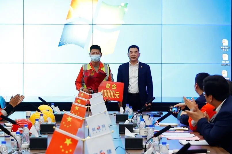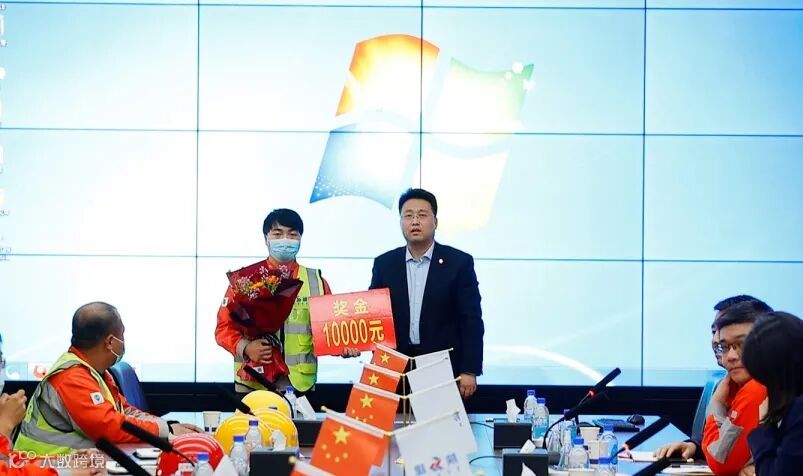 会上,徐永宏、王政、赵富强、弋戈、周超文为获得第十周劳动竞赛优胜的区域和优秀个人颁发了鲜花、证书及奖金,并和他们一一握手交谈,鼓励他们在工作上再接再厉,用实际行动带动项目生产。