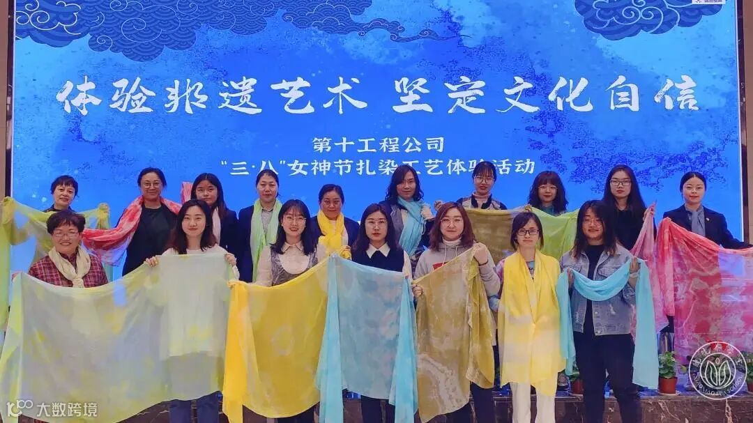 第十工程公司工会举办了体验非物质文化遗产——扎染工艺艺术的庆祝活动。通过学习、观看扎染艺术的起源和不同时期的作品,女职工们亲自设计染色,制作了一幅幅属于自己的扎染丝巾艺术作品。