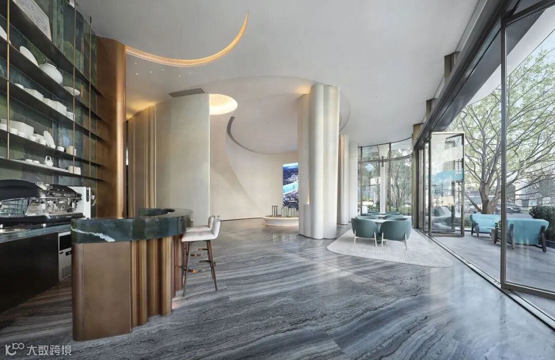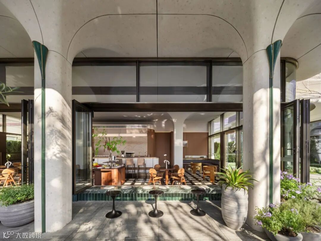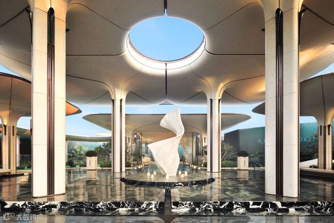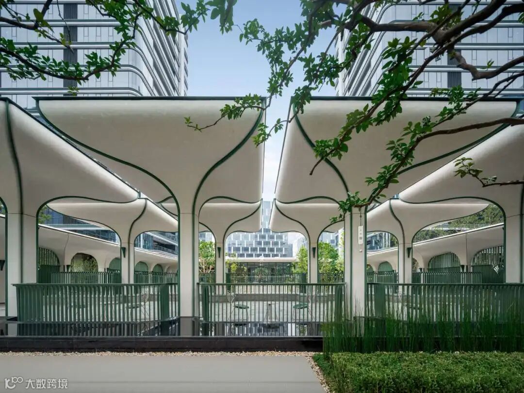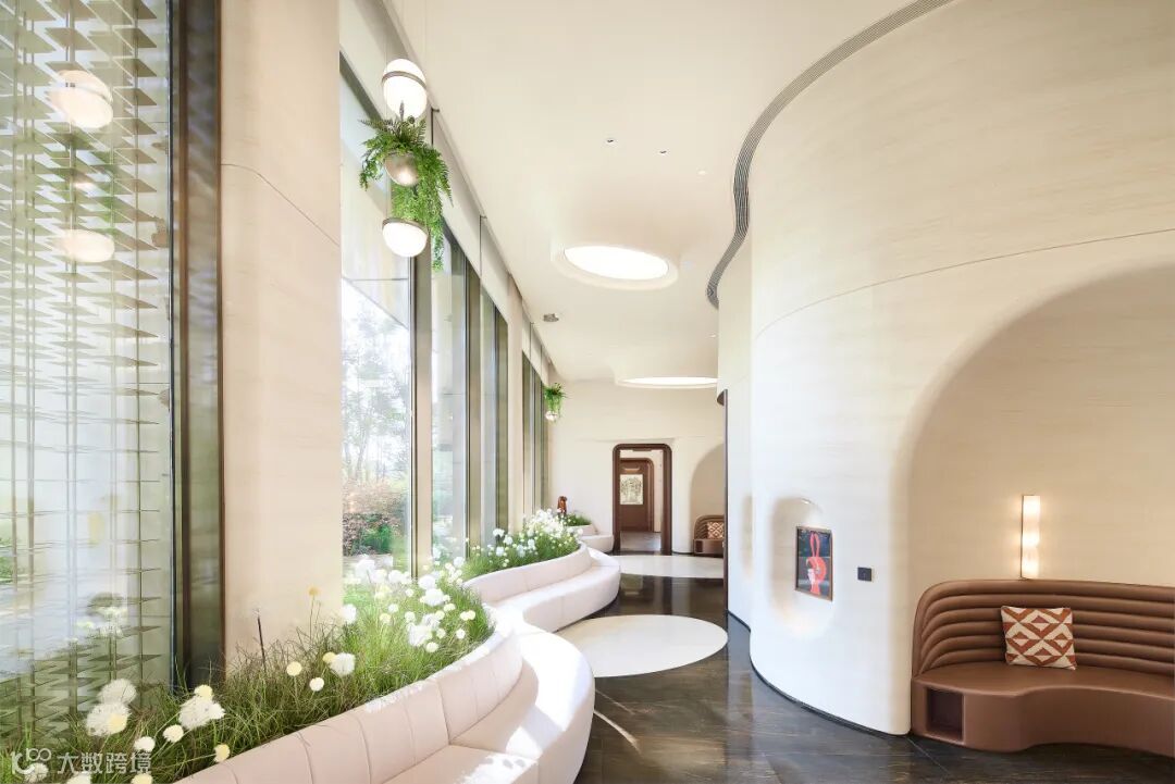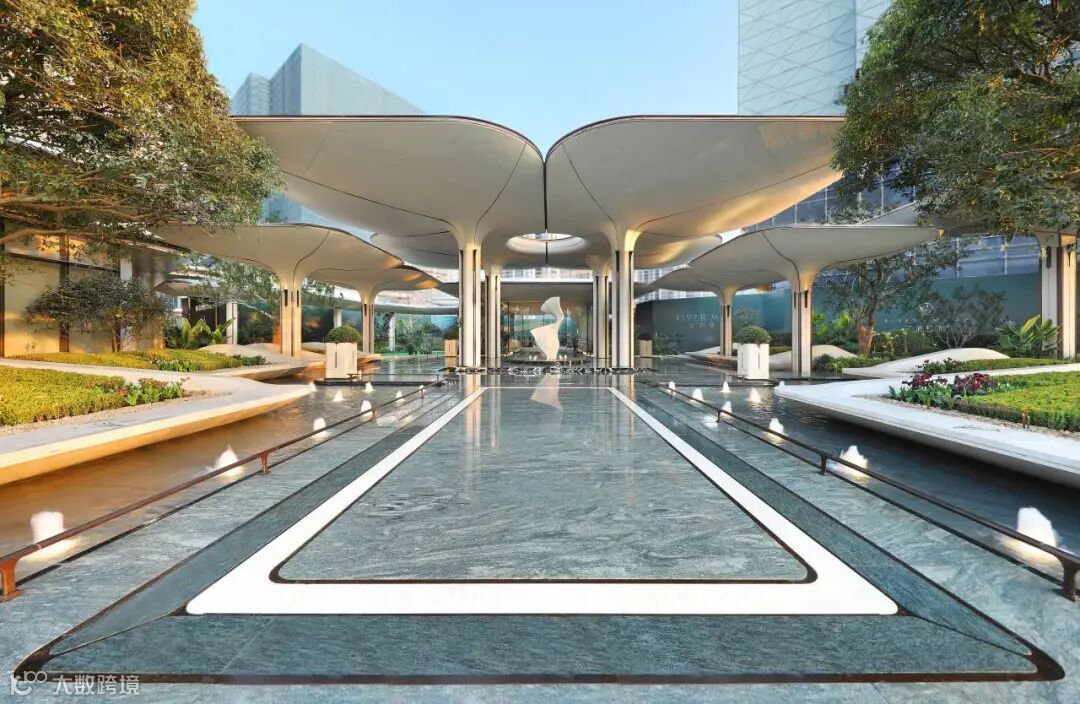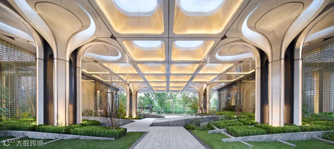 项目示范区营造中,新工艺赋予材质新生,新技术赋能生活美学。示范区大门,约45米宽伞状门庭如云舒展。整座"伞"以型钢为骨,米白UHPC为面,屋檐融入陶板,伞柄融石材、陶棍与不锈钢于一体,勾勒归家的诗意轮廓。