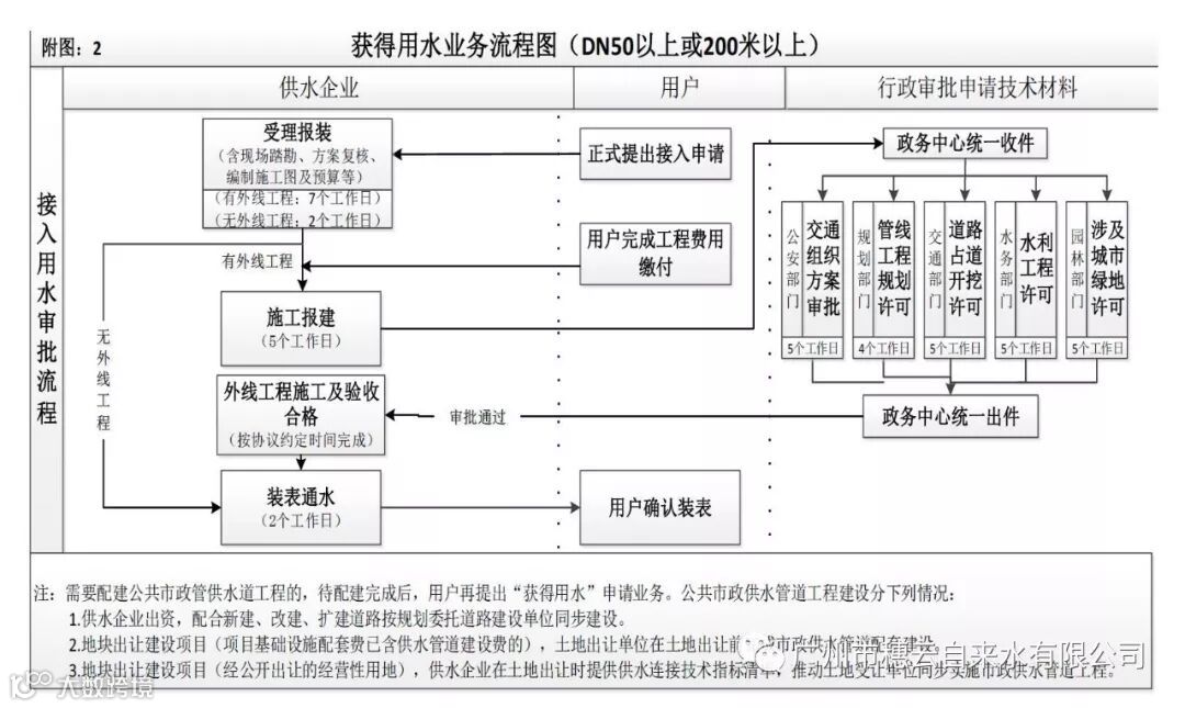 申请人/单位委托供水企业建设外线工程,工程施工不计入供水企业办理环节和时限。 |