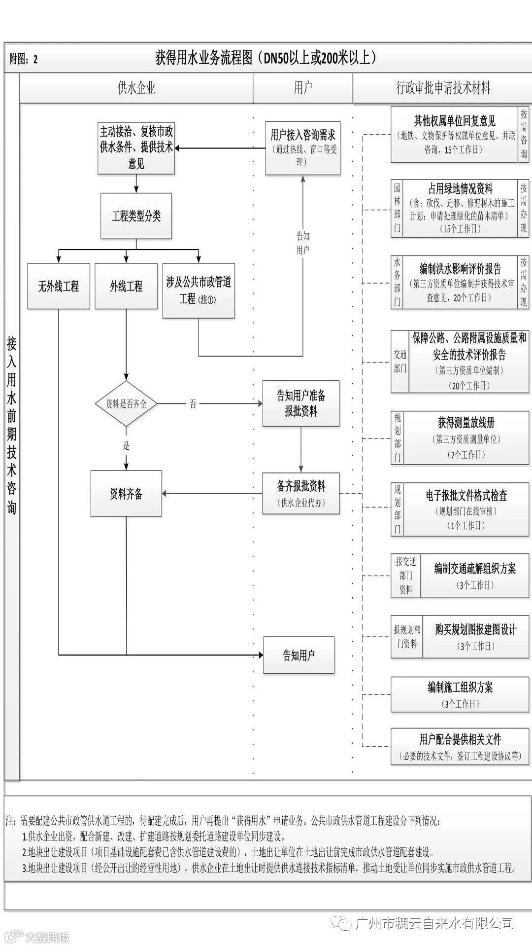 广州市穗云自来水有限公司供水范围内,新装管道DN50以上或长度200米(不含)以上(实行总表供水的行政村除外)。