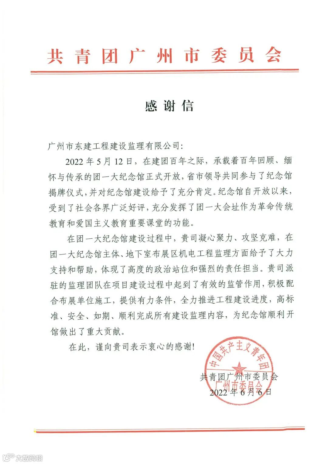 近日,珠江监理东园文化广场项目(团一大纪念馆)收到来自广州团市委的感谢信。信中,广州团市委对珠江监理属下东建监理在团一大纪念馆主体和地下室机电建设过程中,全力保障建设进度,积极配合布展单位,匠心打造全国青少年红色教育阵地,确保场馆5月12日顺利对外开放所做出的积极贡献,给予了充分的肯定,表达了衷心的感谢。
