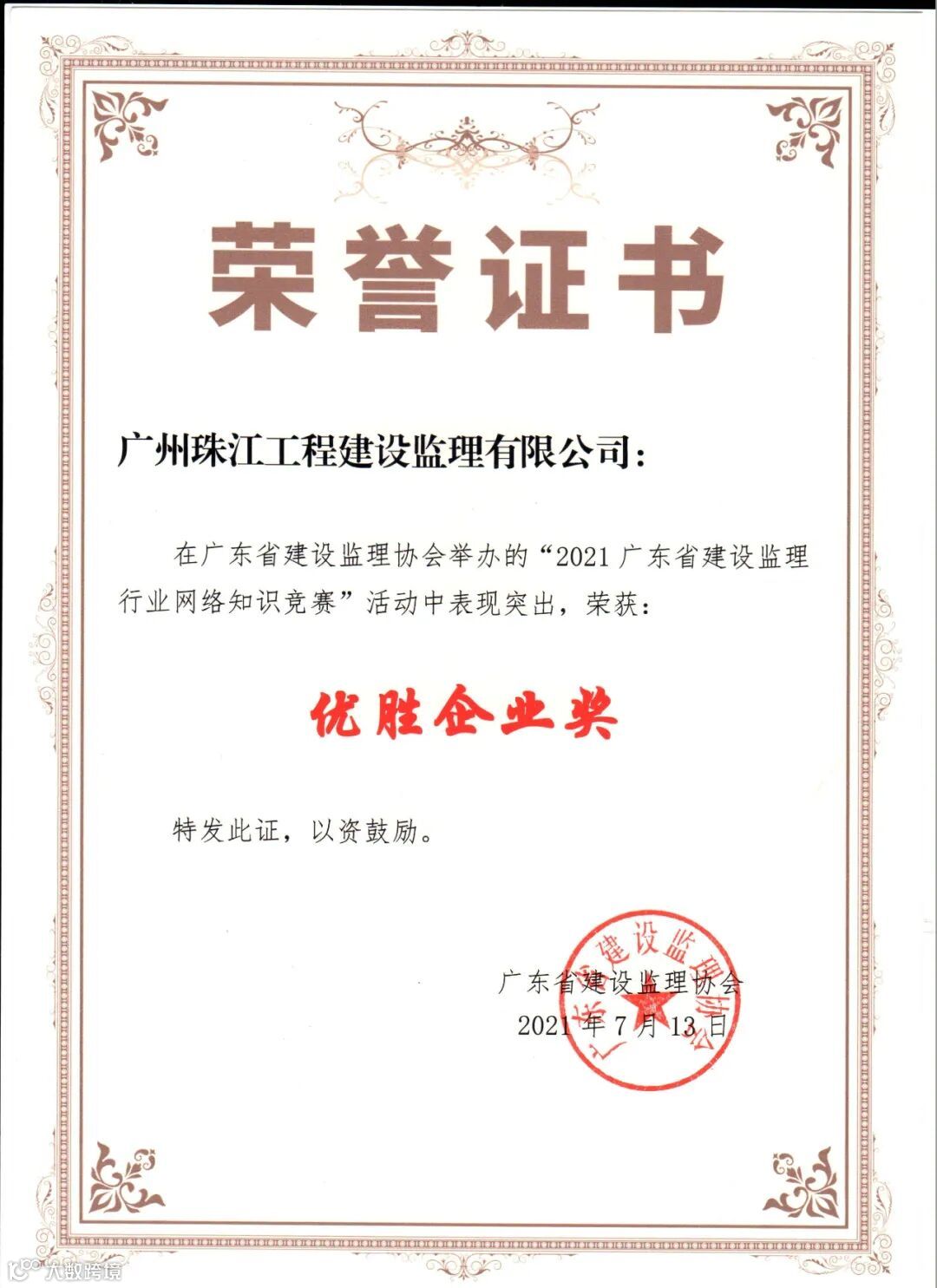 近期,珠江监理组织员工参加“2021广东省建设监理行业网络知识竞赛”活动,获优胜企业奖。