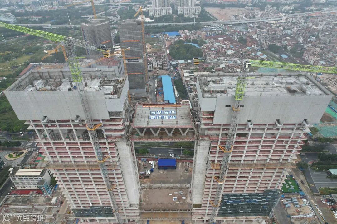 12月15日,中交集团南方总部基地C区项目上连廊钢结构桁架提升圆满完成!广州之窗的完整形态初步呈现!本次提升的C区上连廊钢结构长46.5米,宽25米,总重量约1020吨,采用下连体顶部拼装和整体提升的方式,提升高度80米,完工后将连通东西两塔,是广州之窗“001”整体造型的最后一笔。