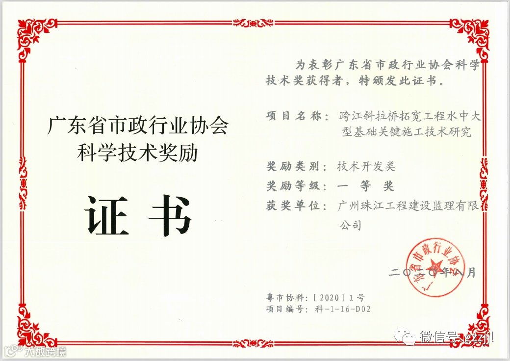 近日,珠江监理洛溪大桥拓宽工程项目工程科研成果《跨江斜拉桥拓宽工程水中大型基础关键施工技术研究》荣获广东省市政行业协会科学技术开发类一等奖。评审组指出该研究成果对相关技术领域进行了有效研发,具有较大的创新性、实用性,达到了国内及国际领先水平,具有较好的经济效益和社会效益。