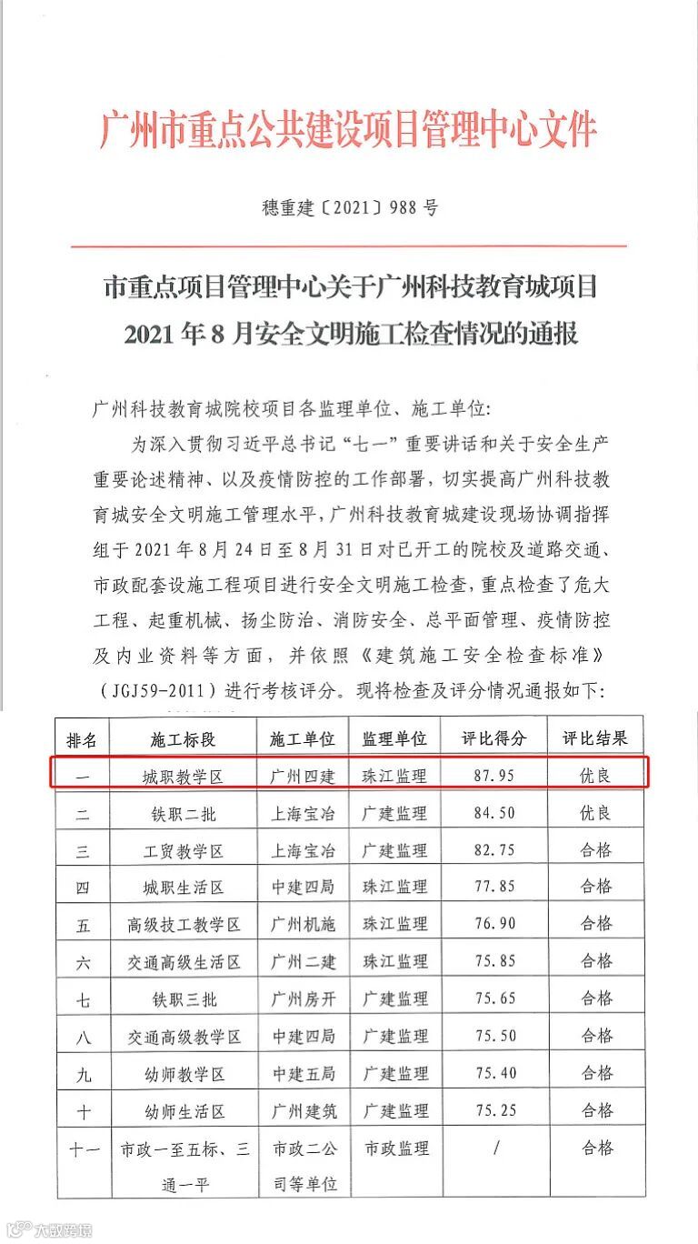 市重点项目管理中心对科教城一期13所院校进行第二次月度综合考评,珠江监理广州城市职业学院迁建工程在2021年7月、8月科教城一期13所院校工程月度综合考评中连续两次荣获第一名。