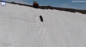 但由于大雪覆盖着大山,两只熊只能在雪坡上踏着雪艰难往上爬。