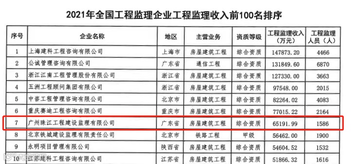 在国家住房和城乡建设部发布2021年全国建设工程监理企业基本数据统计结果中,珠江监理在全国12407家建设工程监理企业综合排名第七,房建排名位列第六,双双跻身全国十强!近年来,珠江监理保持着快速发展的势头,克服疫情反复影响,贯彻落实公司“十四五”规划,实施“走出去”战略,并购浙江元兴、补齐水利资质短板,坚持改革创新、科技赋能,不断强化企业现代化治理能力建设,公司综合实力和品牌影响力日臻提升,首次跻身全国十强,为企业做强做大做优提供坚实的动力。