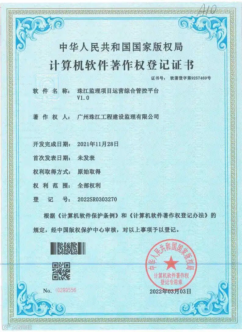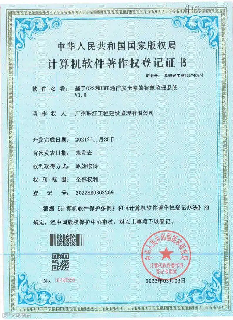 近日,珠江监理新增《珠江监理项目运营综合管控平台》《基于GPS和UWB通信安全帽的智慧监理系统》两项计算机软件著作权。