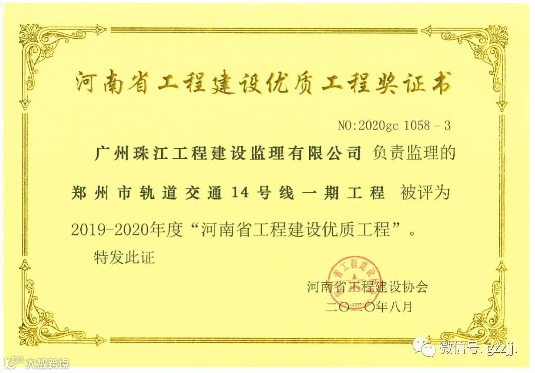 近日,珠江监理郑州市轨道交通14号线一期工程被评为2019-2020年度“河南省工程建设优质工程”。