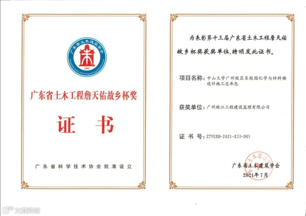 近日,珠江监理中山大学广州校区东校园化学与材料楼项目荣获“第十三届广东省土木工程詹天佑故乡杯奖”。