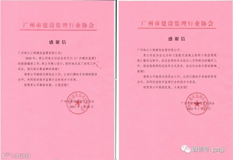 1月28日,珠江监理收到广州市建设监理行业协会的感谢信,感谢珠江监理对协会工作的大力支持。